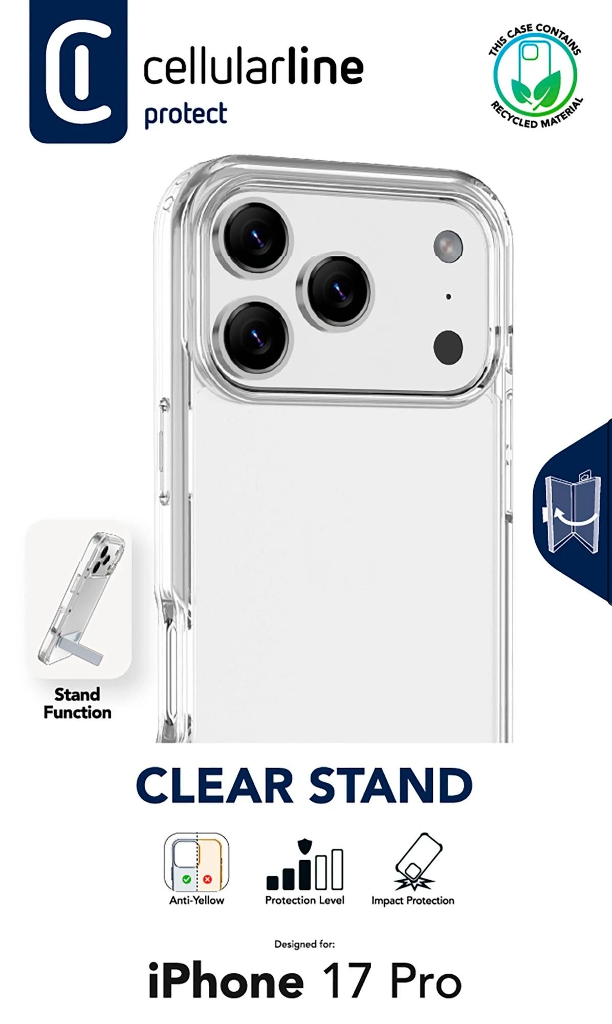 Clear Stand ist die transparente Schutzhülle mit integriertem Standfuß – ideal für freihändiges Telefonieren, Streaming oder Arbeiten. Sie besteht aus einem harten Rücken und stoßdämpfendem Gummirahmen und schützt zuverlässig vor Stößen und Stürzen. Erhöhte Kanten schützen Bildschirm und Kamera. Die antibakterielle Oberfläche und das Anti-Vergilbungs-Material sorgen für dauerhafte Hygiene und Klarheit.